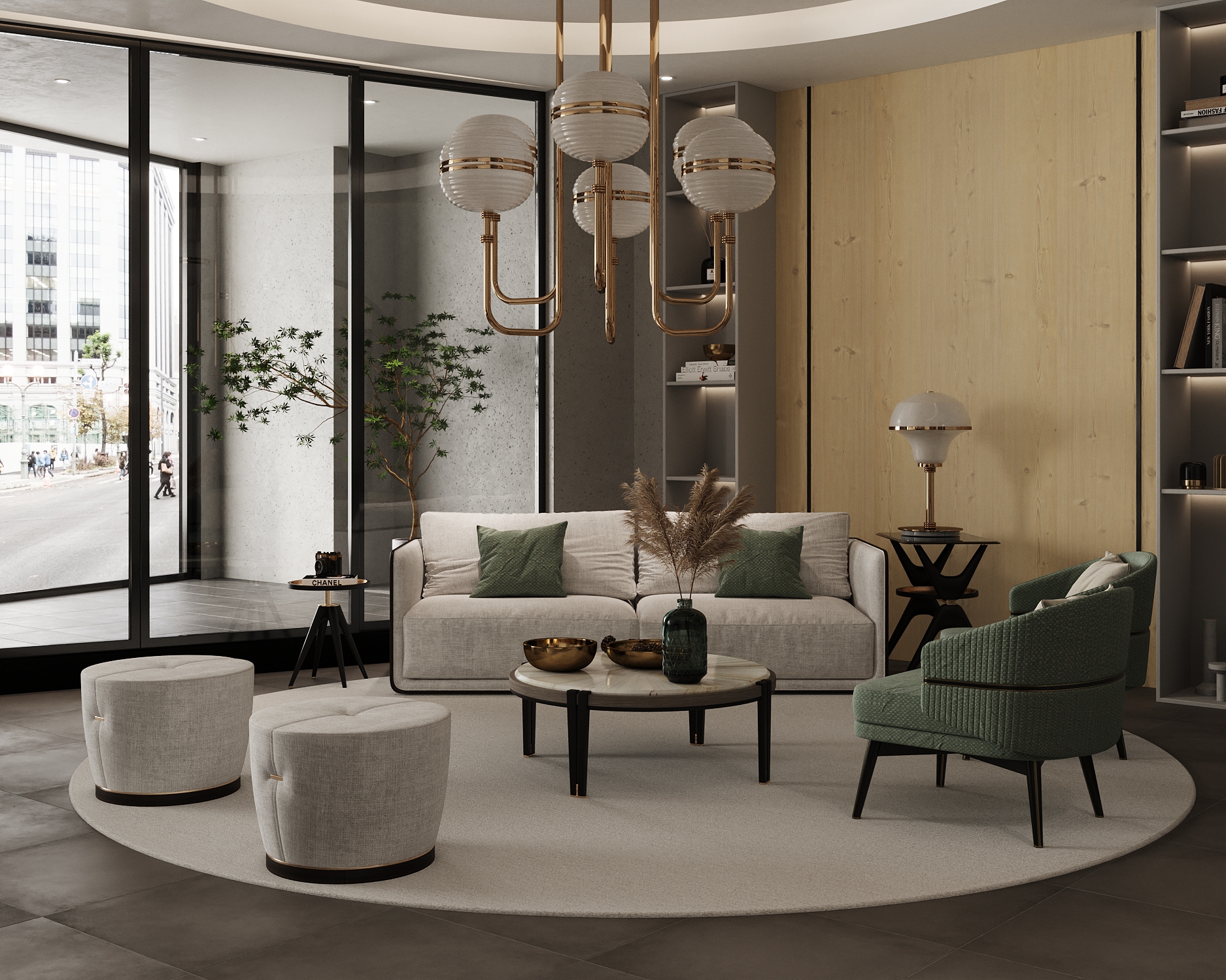Mark's design will provide the seat with absolute comfort. A robust wood structure supports the chair's silhouette, which highlights a generous backrest and seat. The discreet brass element outlining the fabric adds an extra touch of elegance.