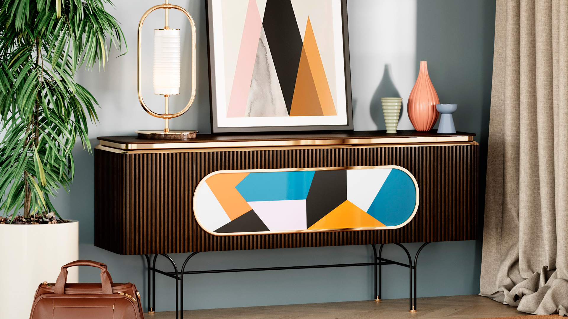 The Bailey sideboard is a very versatile piece since it can be placed in a living room or be used as a drinks cabinet. Produced in classic materials such as solid walnut wood with additional brass features, Bailey gives the room a touch of luxurious subtlety. The lacquered colors on the front are the main feature of this masterpiece, which turns it into a must-have in any modern vintage space.