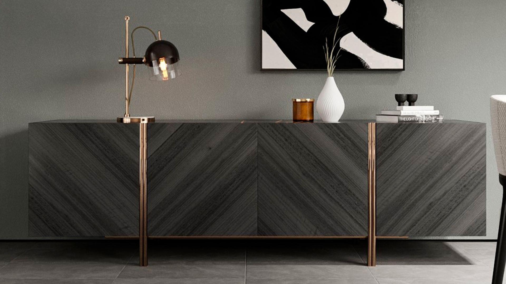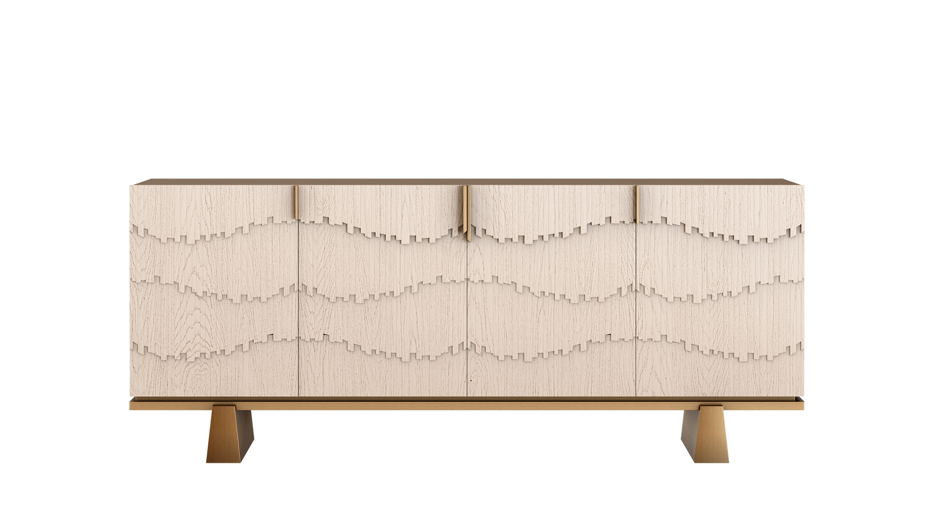 The Cliff sideboard is a reference to modern luxury design. Its elegant appearance embellished by hypnotizing wood details covering all structure rests on strong brass feet that give a more interesting look. Cliff is an encounter between nature and magnificence.