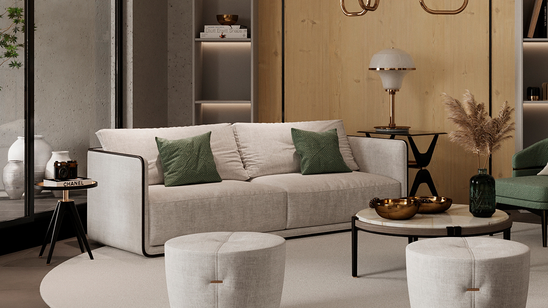 Denning's design brings a sense of modernity to the interior. There is a perfect contrast between the curved shape and the more straight seat, and the leather seam guiding the eye throughout the silhouette creates a beautiful feature in the design. The generous back cushions will guarantee ultimate comfort.
