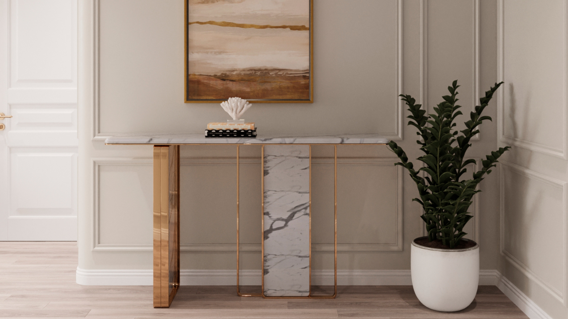The Gold Console conveys elegance and sophistication through its clean and simple lines, emphasizing the nobility of the materials. The balance between brass’ minimalism and alluring marble evokes a luxurious look, while the references to the geometry on the console’s base give the design a unique touch of creativity and modernity.